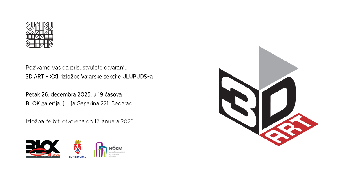 Izložba skulptura vajarske sekcije ULUPUDS-a, pod nazivom “ XXII 3D Art „, u novobeogradskoj Blok galeriji, Jurija Gagarina 221, biće otvorena u petak, 26. decembra, s početkom u 19 časova.