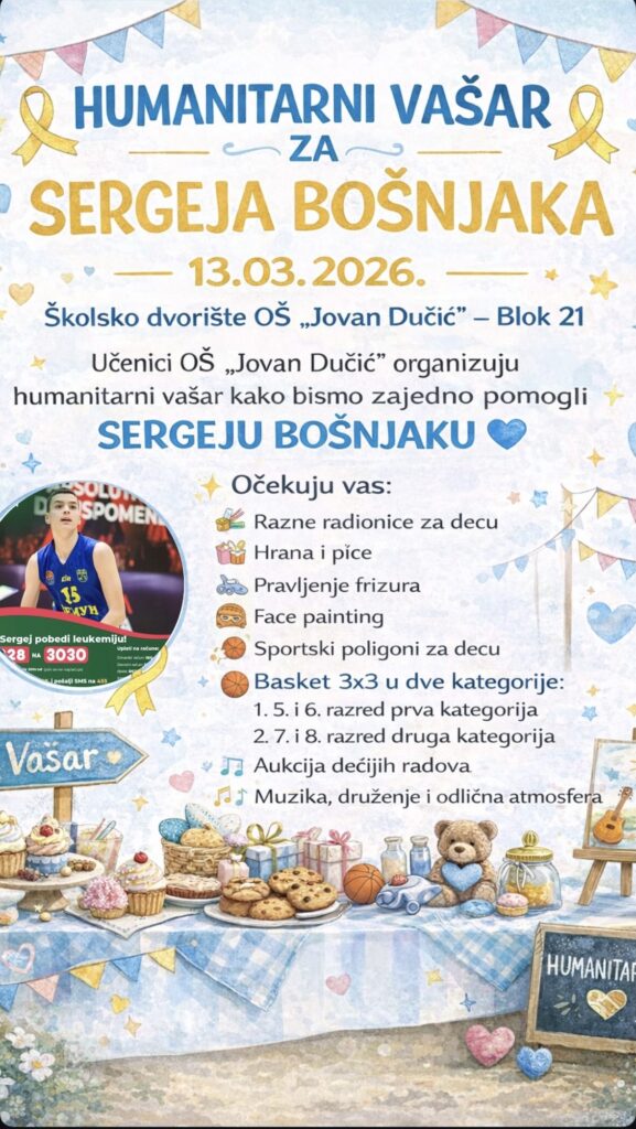 U školskom dvorištu OŠ „Jovan Dučić” u Bloku 21, 13. marta 2026. godine, biće organizovan humanitarni vašar sa jednim ciljem – da se zajedničkim snagama pomogne Sergeju Bošnjaku.