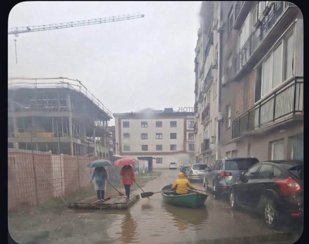 Na fotografiji koja je stigla redakciji vidi se kako jedan sugrađanin vesla kroz vodu, dok se drugi snalaze i prelaze preko improvizovane platforme sa kišobranima u rukama.